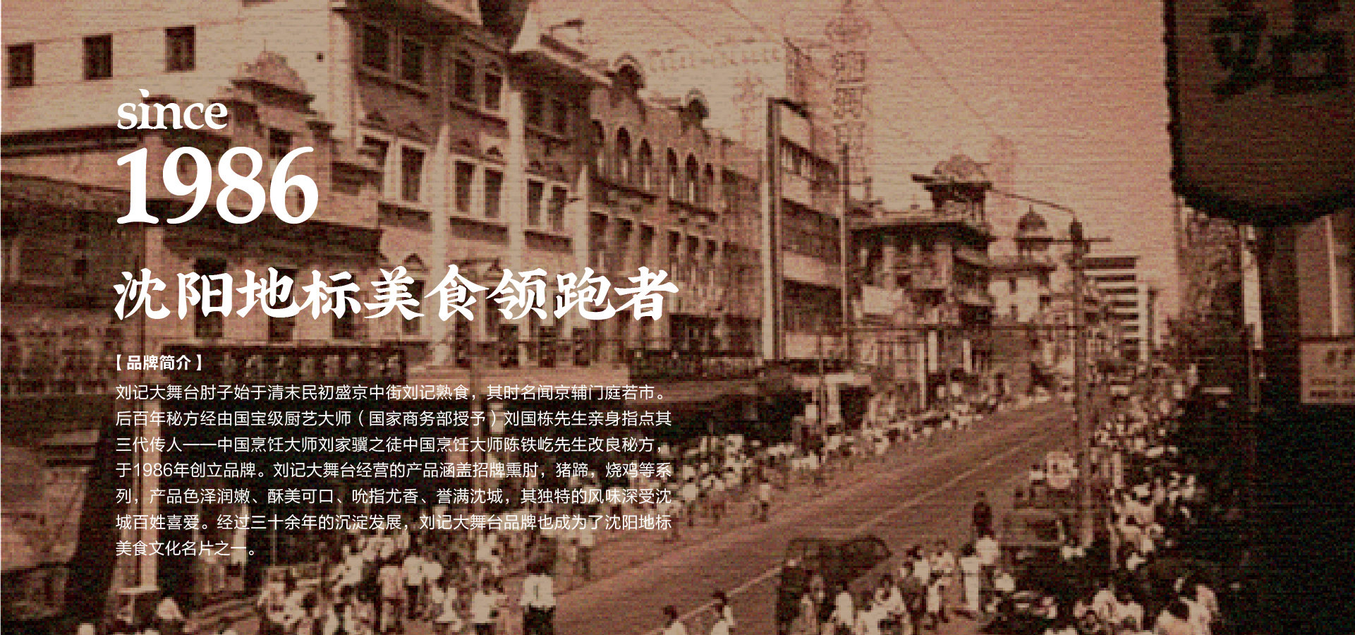 盛京,昔乃大清王朝發祥之地。劉記大舞臺肘子始于清末民初盛京中街劉記熟食,其時名聞京輔門庭若市。后百年秘方經由國寶級廚藝大師(國家商務部授予)劉國棟先生親身指點其三代傳人——中國烹飪大師劉家驥之徒中國烹飪大師陳鐵屹先生改良秘方,于1986年創立品牌。劉記大舞臺經營的產品涵蓋招牌熏肘,豬蹄,燒雞等系列,產品色澤潤嫩、酥美可口、吮指尤香、譽滿沈城,遂成古今絕味,其獨特的風味深受沈城百姓喜愛。經過三十余年的沉淀發展,劉記大舞臺品牌也成為了沈陽地標美食文化名片之一。